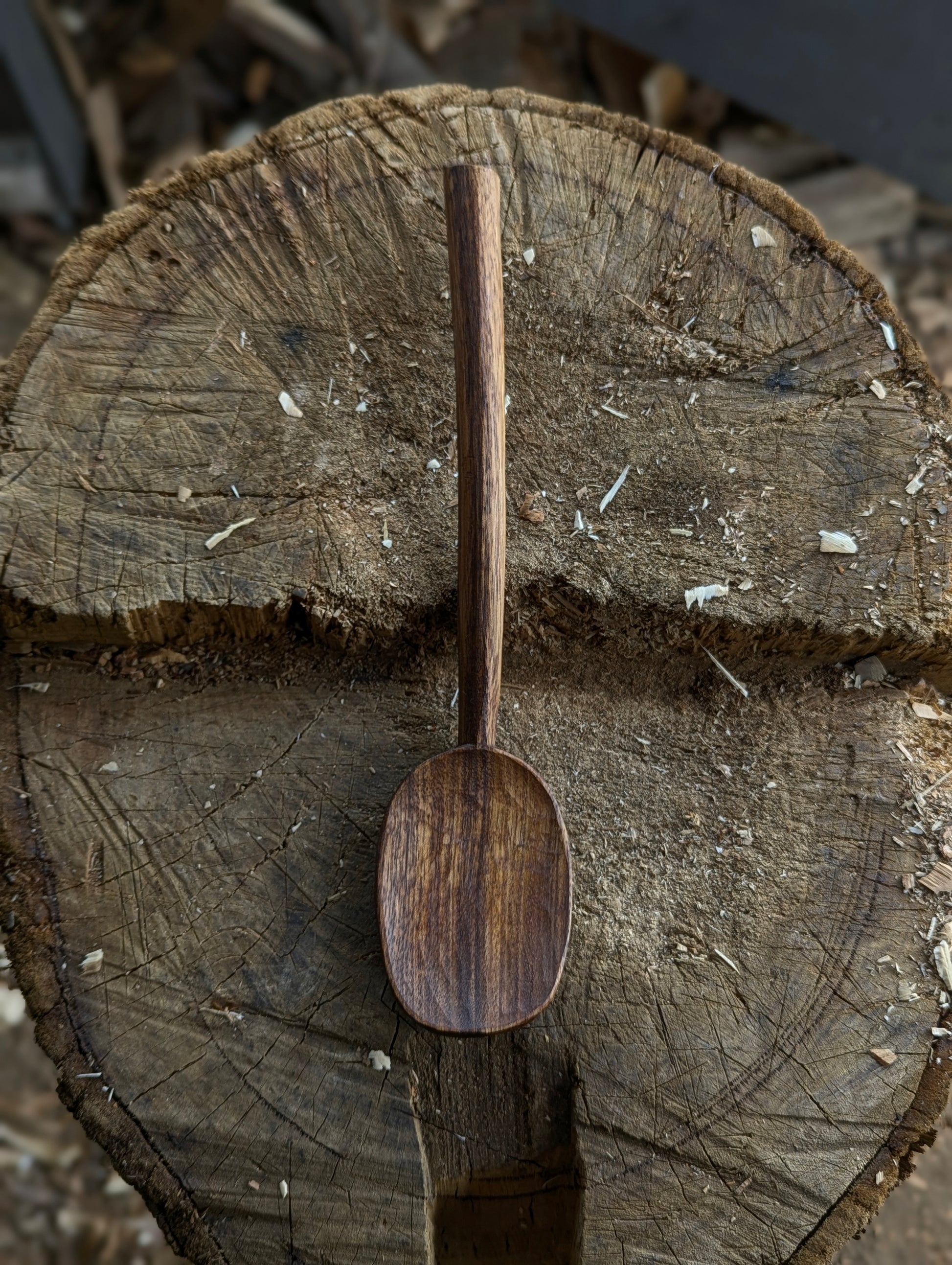 Hand carved from locally sourced Acacia Melanoxylon using only an axe and knife. Burnished and coated with a blend of organic Walnut and Carnauba wax for a water-resistant finish. 30cm length, ready to ship