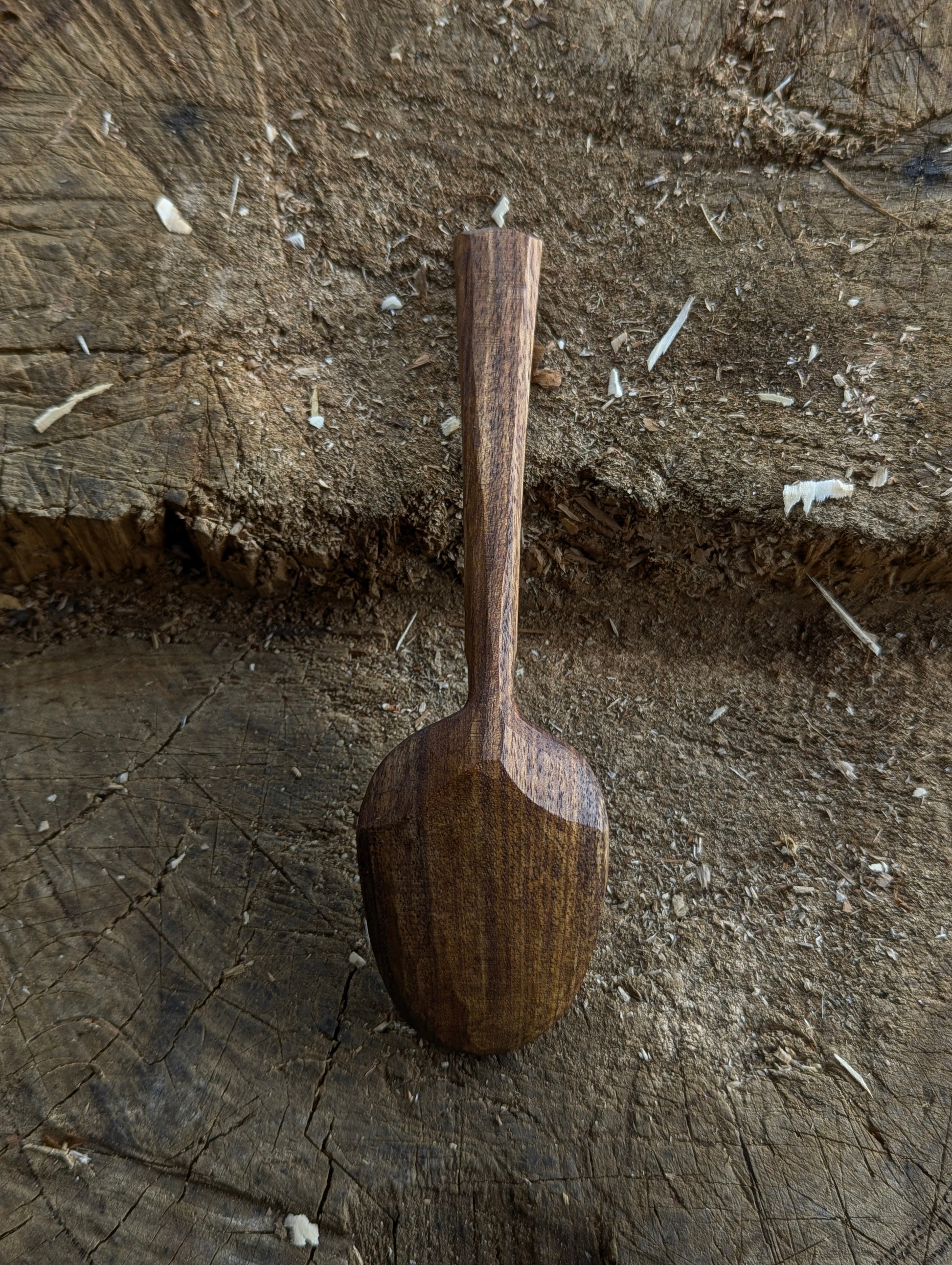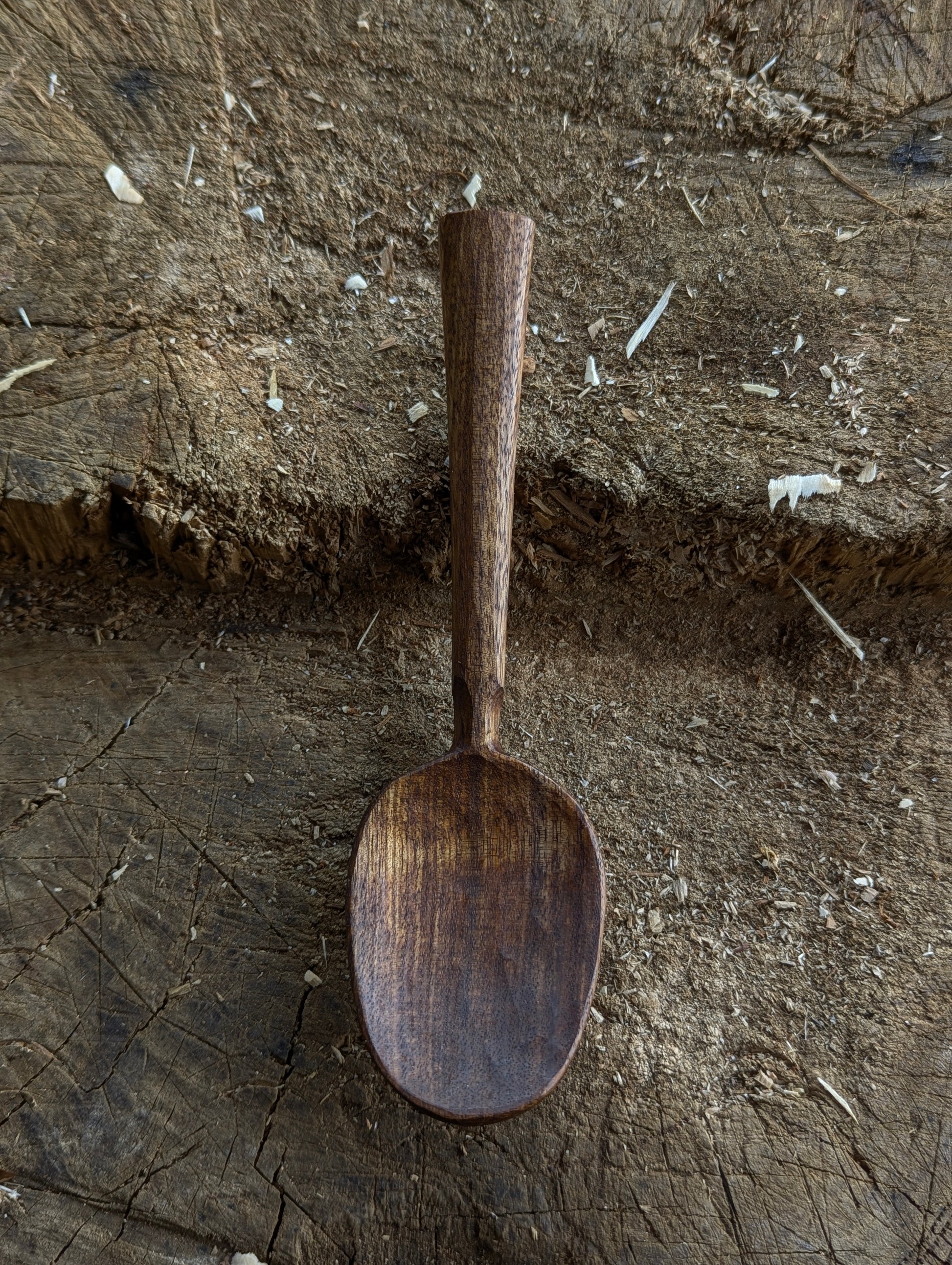 Hand carved from locally sourced Acacia Melanoxylon using only an axe and knife. Burnished and coated with a blend of organic Walnut and Carnauba wax for a water-resistant finish. 14cm length, ready to ship