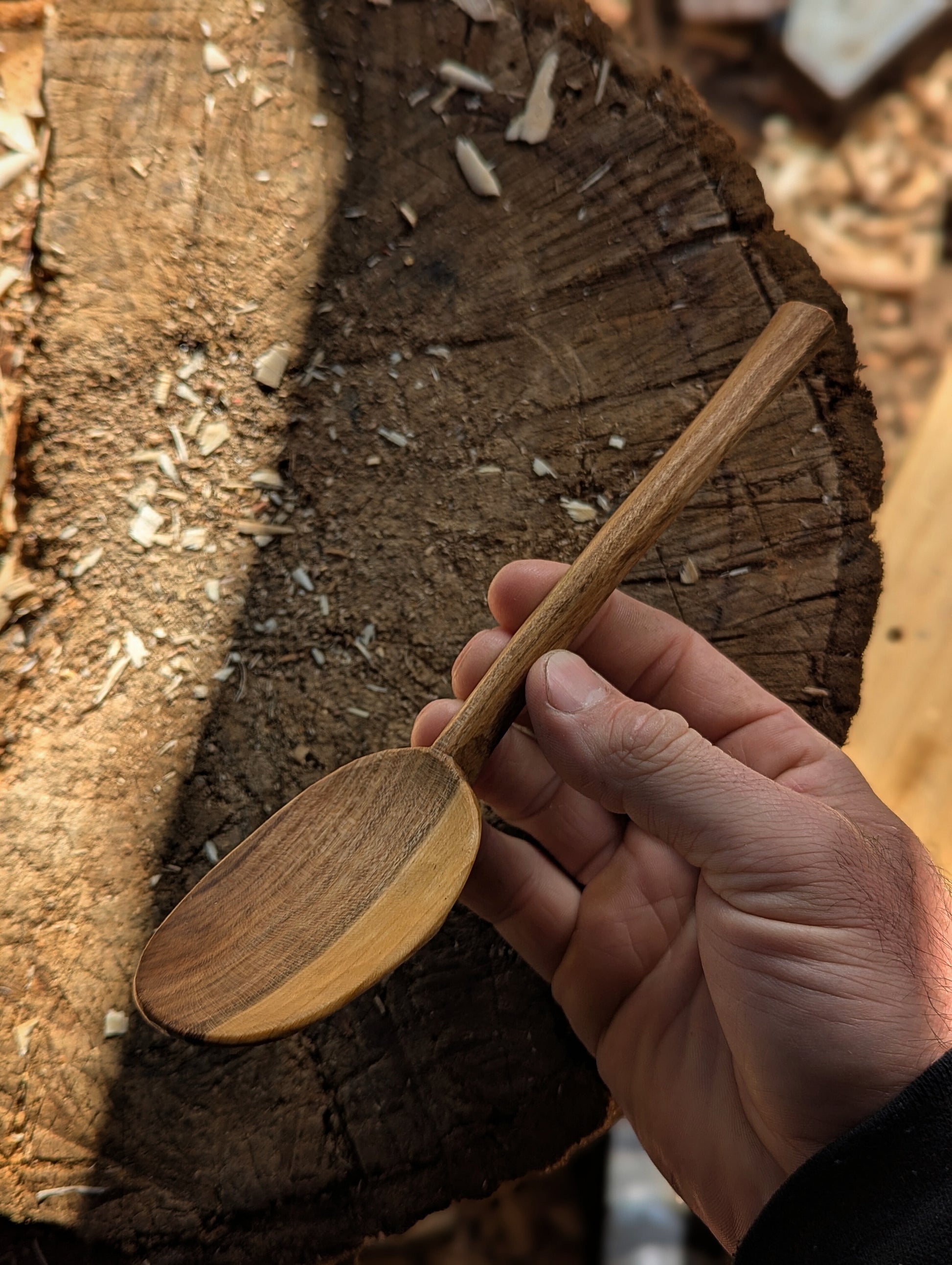 Hand carved from locally sourced Cherry (Prunus Serulata) using only an axe and knife. Burnished and coated with a blend of organic Walnut and Carnauba wax for a water-resistant finish. ready to ship