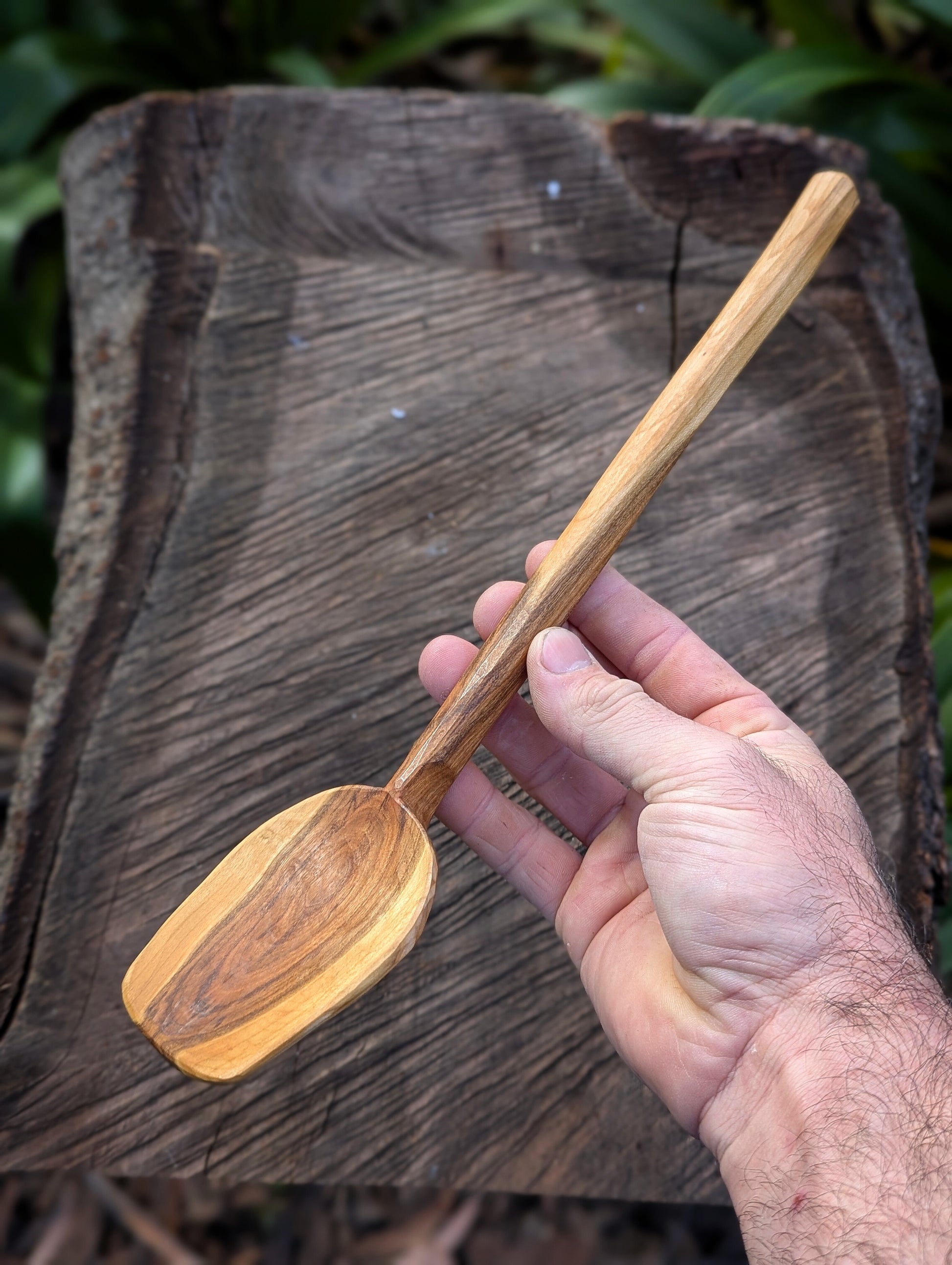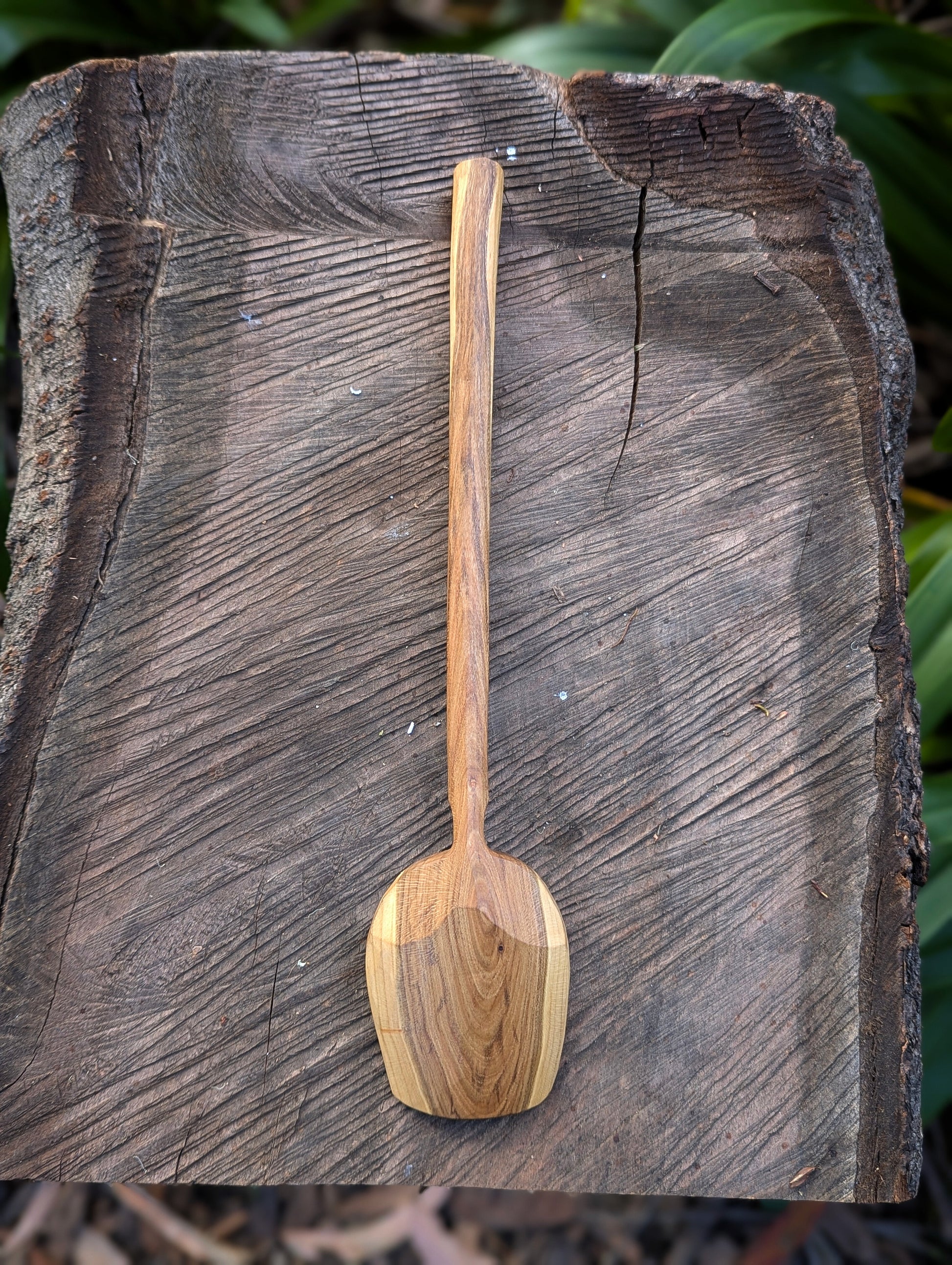 Hand carved from locally sourced Cherry (Prunus Serulata) using only an axe and knife. Burnished and coated with a blend of organic Walnut and Carnauba wax for a water-resistant finish. 30cm length, ready to ship